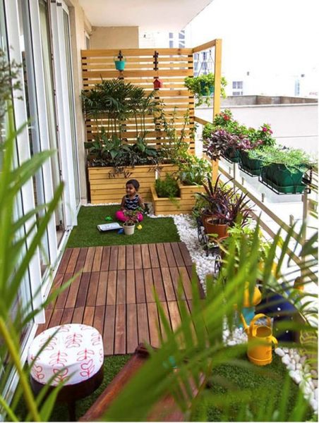 Mẫu ban công này được tạo ra để dành cho những người nào thích đọc sách ngoài trời và ăn nhẹ tại đây. Đây là phần mở rộng nội thất của ngôi nhà với những mảnh ghép thiết kế độc đáo tạo sự thích thú với bất kỳ ai ngồi tại đây. Đầu tiên hãy sử dụng một thấm thảm với màu rực rỡ đặt trên nền sàn bê tông vừa để chống bẩn, chống nóng lại vừa để trang trí cho không gian thêm hài hòa hơn. Tiếp theo tới bộ bàn uống cafe có độ đàn hồi cao tạo nên sự thoải mái khi ngồi đọc sách và khiến đầu óc của mọi người có cảm giác thư giãn hơn. Ban công với tường và sàn lát ván gỗ. Một bức tường lát ván gỗ tạo vừa tạo nên sự hoang dại vừa khiến cho không khí mát mẻ hơn. Trên tường treo thêm một vài chậu hoa và đèn dây nối khiến sắc thái hài hòa và lung linh vô cùng đặc biệt là vào buổi tối. Ghế gỗ kèm đệm êm ái chống chịu thời tiết, sàn gỗ mộc mạc có thể tận dụng làm chỗ ngồi thoải mái. Trồng thêm một vài chậu cây cảnh to bên cạnh giống như đây là khu rừng nhiệt đới vậy. Ban công bảo mật cao với chi tiết tường bằng gỗ. Một ban công đẹp được bao bọc kín mít bởi một hàng tường gỗ được khắc chi tiết, vừa kín đáo nhưng vẫn rất thông thoáng. Kết hợp thêm một vài đồ dùng nhỏ như ghế nôi treo, một vài chậu cây xanh treo ngang tường làm cho không gian lúc nào cũng tràn trề sức sống với màu cam, vàng và xanh lá.