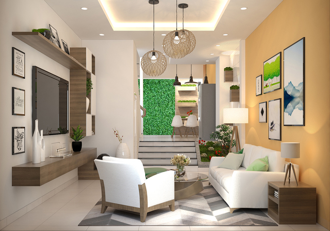 Các hình khối bên ngoài ngôi nhà thiết kế theo mảng lớn nhưng kết hợp hài hòa làm cho ngôi nhà trông rộng lớn mà không quá thô, ngược lại rất thanh thoát và nhẹ nhàng.Không gian bên trong nhà đáp ứng đầy đủ không gian sinh hoạt của một gia đình Việt Nam, bao gồm phòng khách, phòng ngủ, nhà vệ sinh, nhà bếp, phòng sinh hoạt gia đình và phòng làm việc. Tất cả được phân chia hợp lý để phù hợp với diện tích vừa phải. Phòng khách được bố trí vị trí trung tâm có không gian lớn.